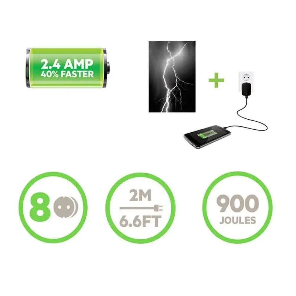 EIGHT-OUTLET PROTECTION WITH TWO USB PORTS :