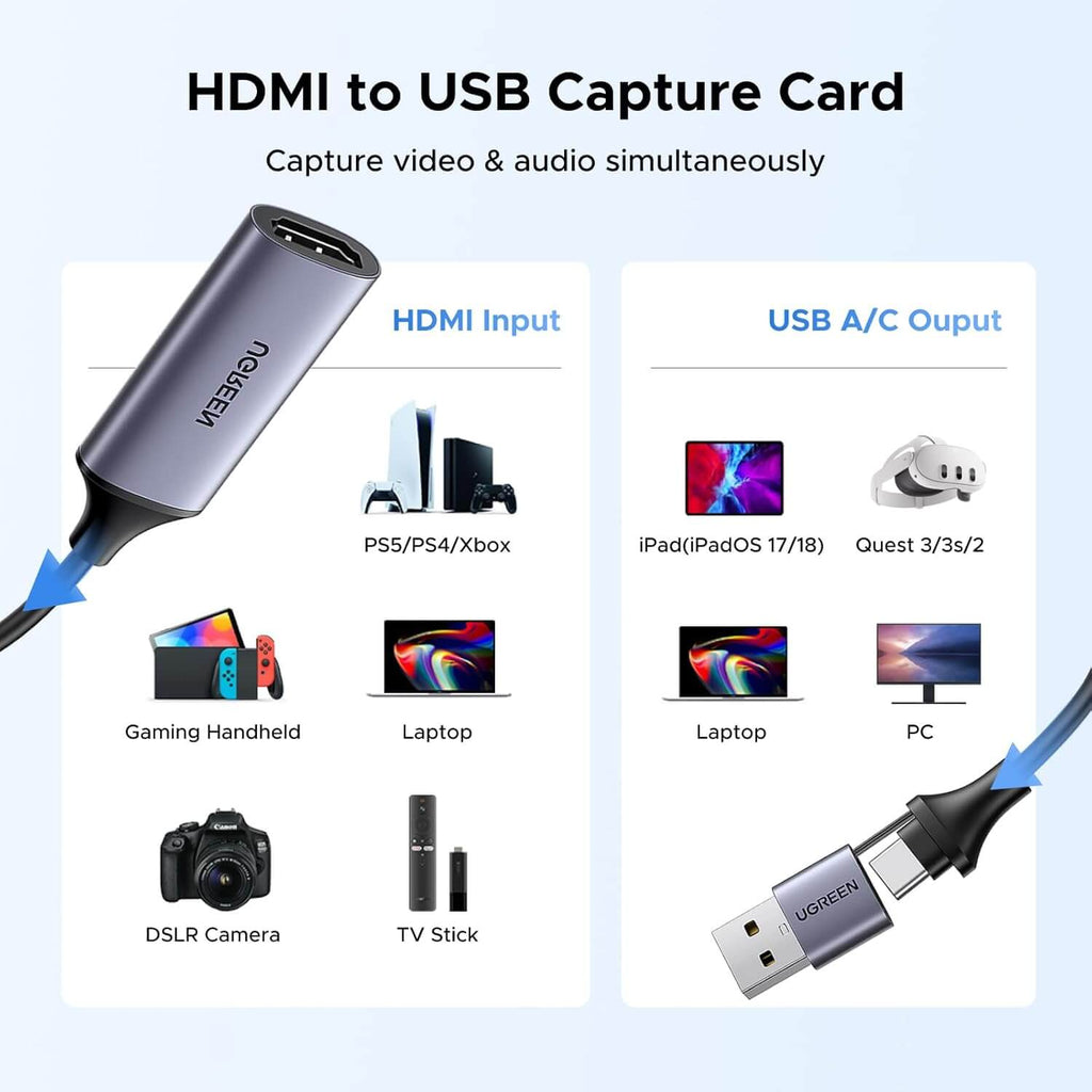 - 4K Full HD Video Capture Card: UGREEN HDMI Capture Card supports input max resolution up to 4K@60Hz, output max resolution up to 1080P@30Hz, and is based on the USB 2.0 high-speed transmission port. This product is connected to audio and video signal sources, such as cameras, and camcorders through the HDMI interface, and transmits it to a device with a USB or type C interface for the recording. Note: This product does not support capture and recording if the signal source is HDCP encryption protocol