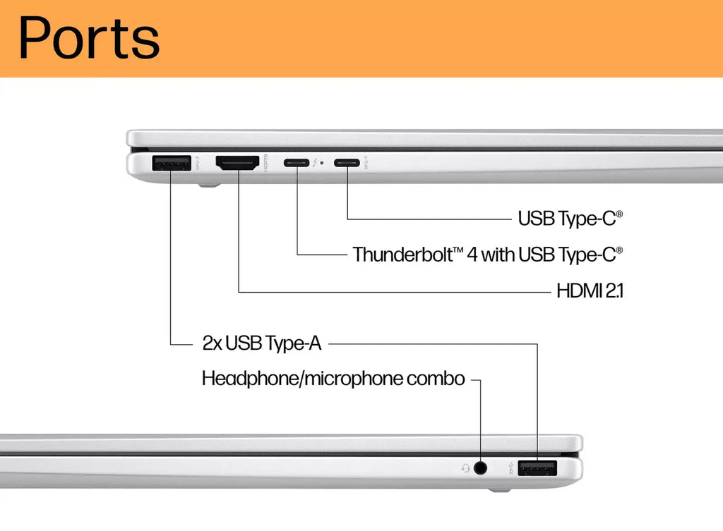 1 USB Type-C® 10Gbps signaling rate (USB Power Delivery, DisplayPort™ 1.4, HP Sleep and Charge); 1 USB Type-A 10Gbps signaling rate (HP Sleep and Charge); 1 USB Type-A 10Gbps signaling rate; 1 HDMI-out 2.1; 1 headphone/microphone combo; 1 Thunderbolt™ 4 with USB Type-C® 40Gbps signaling rate (USB Power Delivery, DisplayPort™ 2.1, HP Sleep and Charge)