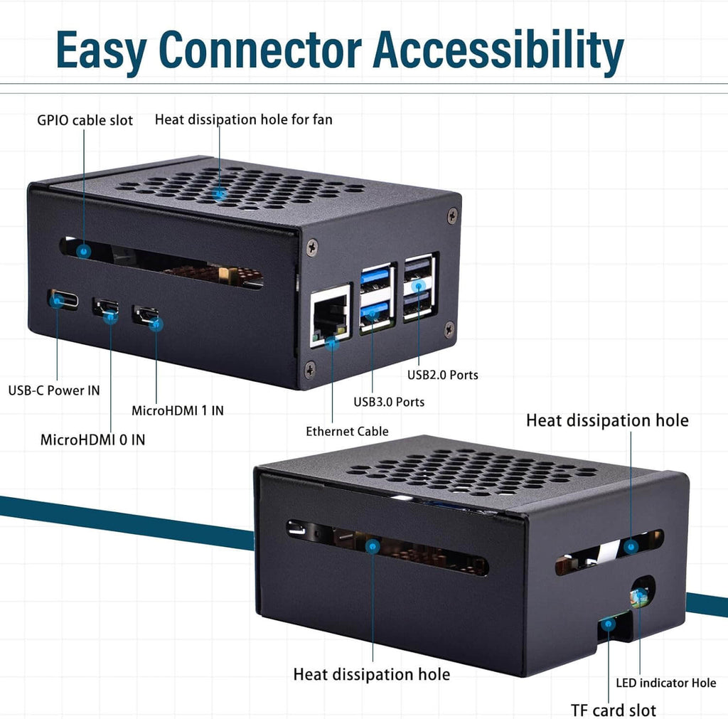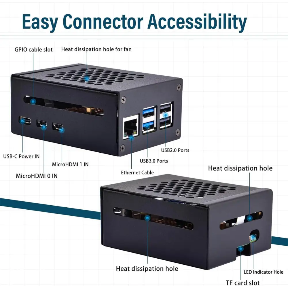 - 【Access to Most Ports】GeeekPi Raspberry Pi 5 Metal Case can accurately access most ports of Raspberry Pi 5 board, including usb-c power jack, micro HDMI ports, usb ports, Ethernet jack, sd card slot, power button, and GPIO port.