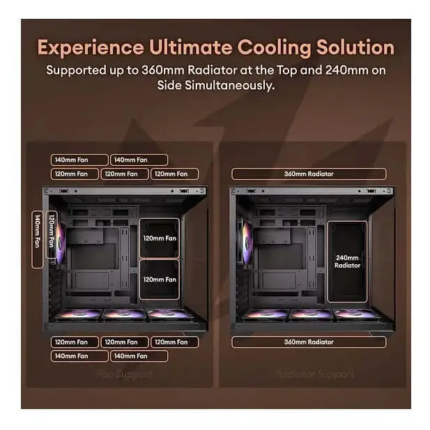 【Experience Ultimate Cooling Solution】Accommodates 360mm radiators at both the top and bottom, and a 240mm radiator on the side simultaneously
