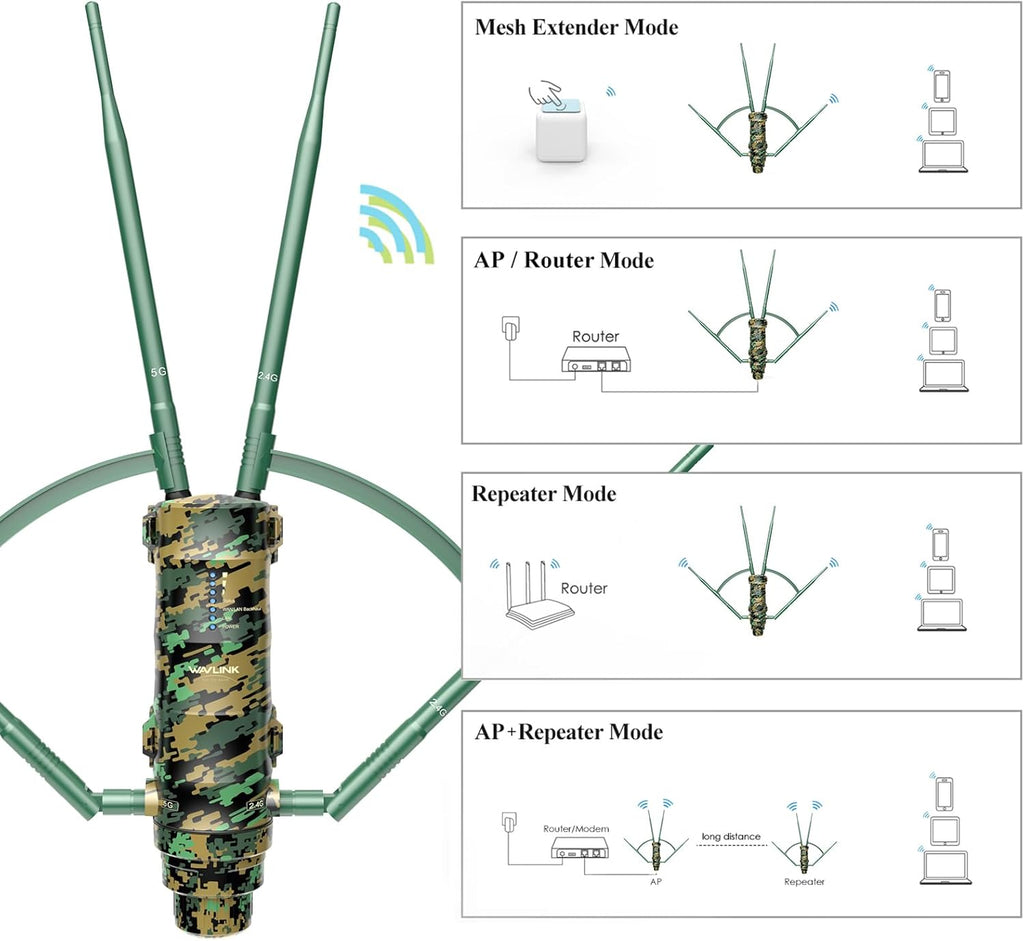 - Multiple Operation Modes & Power Over Ethernet: The WAVLINK router supports Mesh Extender Mode, Access Point (AP) Mode, and Repeater Mode. It can effectively meet different connection needs. Integrated Power over Ethernet supported, transferring data and charging the product with a single Ethernet RJ-45 cable, so you can install the product outdoors where power outlet is not available. Pls note: The PoE converter is not waterproof