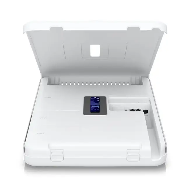 Wall-mounted 10G Cloud Gateway with integrated WiFi 6, high-power PoE switching, and full UniFi application support.