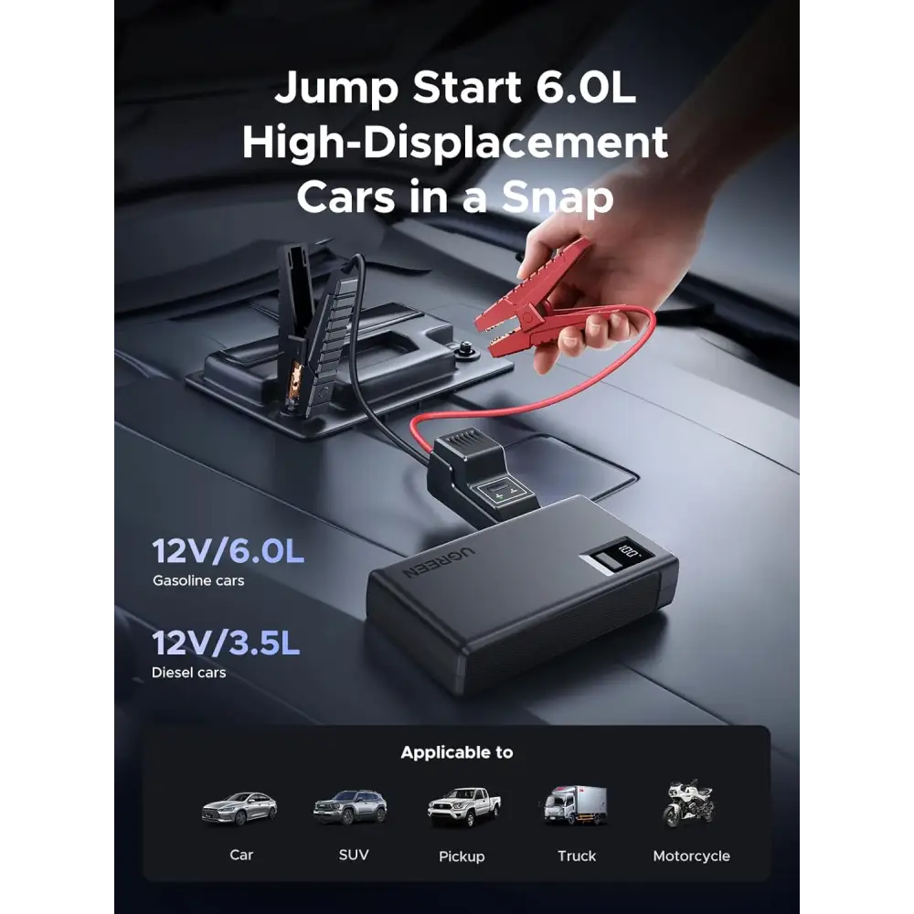 - What you get: UGREEN Car Jump Starter x1, Jumper Cable x1, USB C Cable x1, Storage Bag x1, User Manual x1