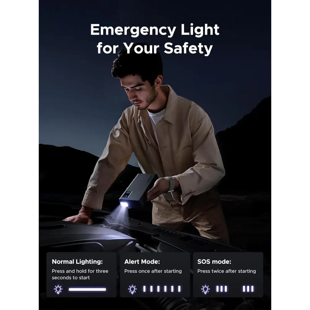 - 3-in-1: It's a car battery jump starter, portable power bank, and LED emergency flashlight. Charge smartphones and tablets with a USB-A and a USB-C ports.