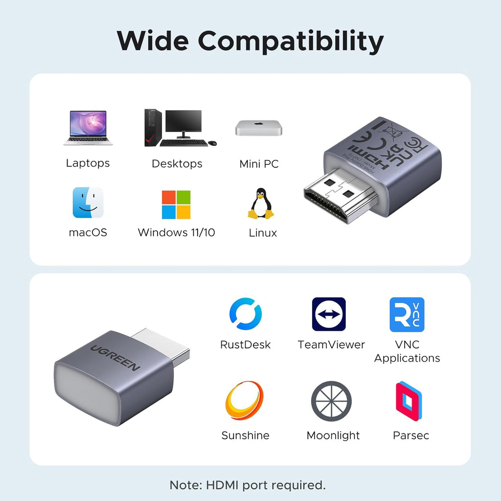 - Wide System Compatibility: The UGREEN HDMI Dummy Plug is universally compatible with any discrete graphics card, laptop, or device with an HDMI output. It works seamlessly with PC Windows, Mac, Linux, and other operating systems. Ideal for game streaming, VR setups, and mini servers with screen sharing, it provides a stable virtual display solution across all your platforms, such as RustDesk/ TeamViewer/Sunshine+Moonlight/Parsec/VNC Applications