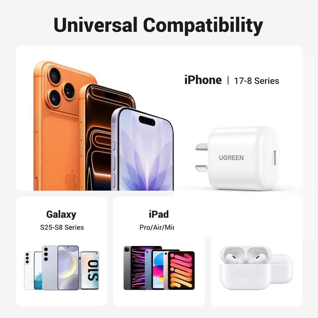 - 20W PD Fast Charging: UGREEN USB C charger supports up to 20W power delivery to charge your new iPhone 15 Pro from 0% to 60% just within 30mins.