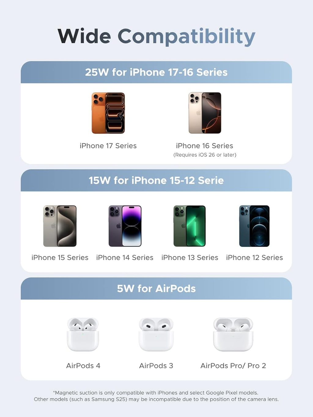 - 25W Ultra-Fast Charging: This Qi2 25W wireless charger delivers ultra-fast 25W charging, significantly exceeding conventional 15W charging. It can charge an iPhone 16 Pro Max from 0% to 50% in 30 minutes, making it the ultimate companion for busy mornings. The iPhone 16 series will also support 25W fast charging with future iOS updates (including iOS 26). *Please use a 45W or higher charger (sold separately).