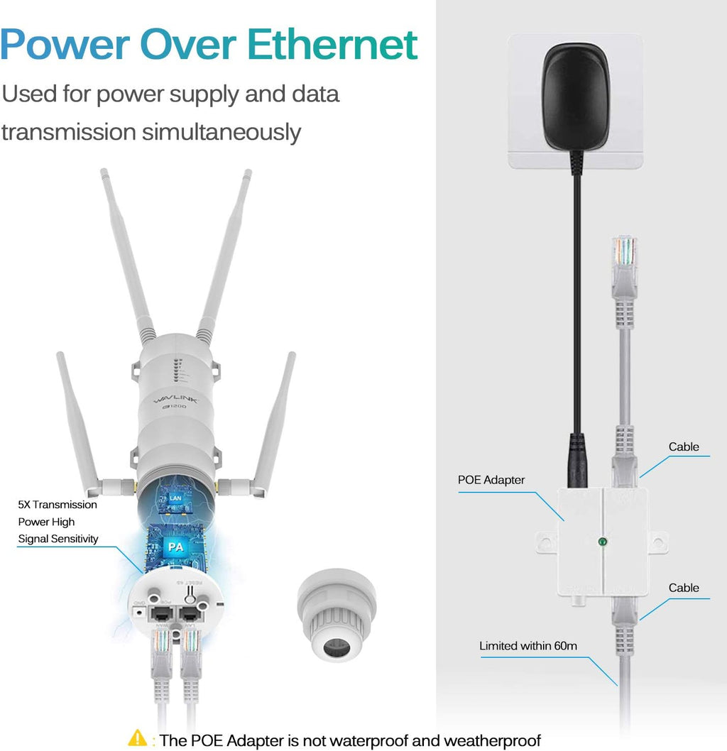 - 【Power Over Ethernet】- Integrated Power over Ethernet (PoE) support, allowing it to be installed in areas where power outlet is not available by combing your power and network data connection into a single RJ-45 cable;【Multi Operation Modes】- Support Access Point (AP), Repeater and Router mode;【1000Mbps Gigabit WAN Port】- Support 10/100/1000Mbps speeds, 10x faster than a standard Ethernet port.