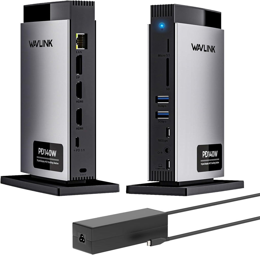 - 【11-in-1 Laptop Docking Station】The WAVLINK multi-port USB C dock includes a 140W PD3.1 USB-C input, 8K HDMI, 2 * 8K DP, USB-C (Host, PD125W), 10Gbps USB-C 3.2, 2 * 5Gbps USB-A ports, an 104MB/s SD/Micro SD card reader , a 1000Mbps RJ45 Ethernet port, and a TRRS 4-pole phone jack