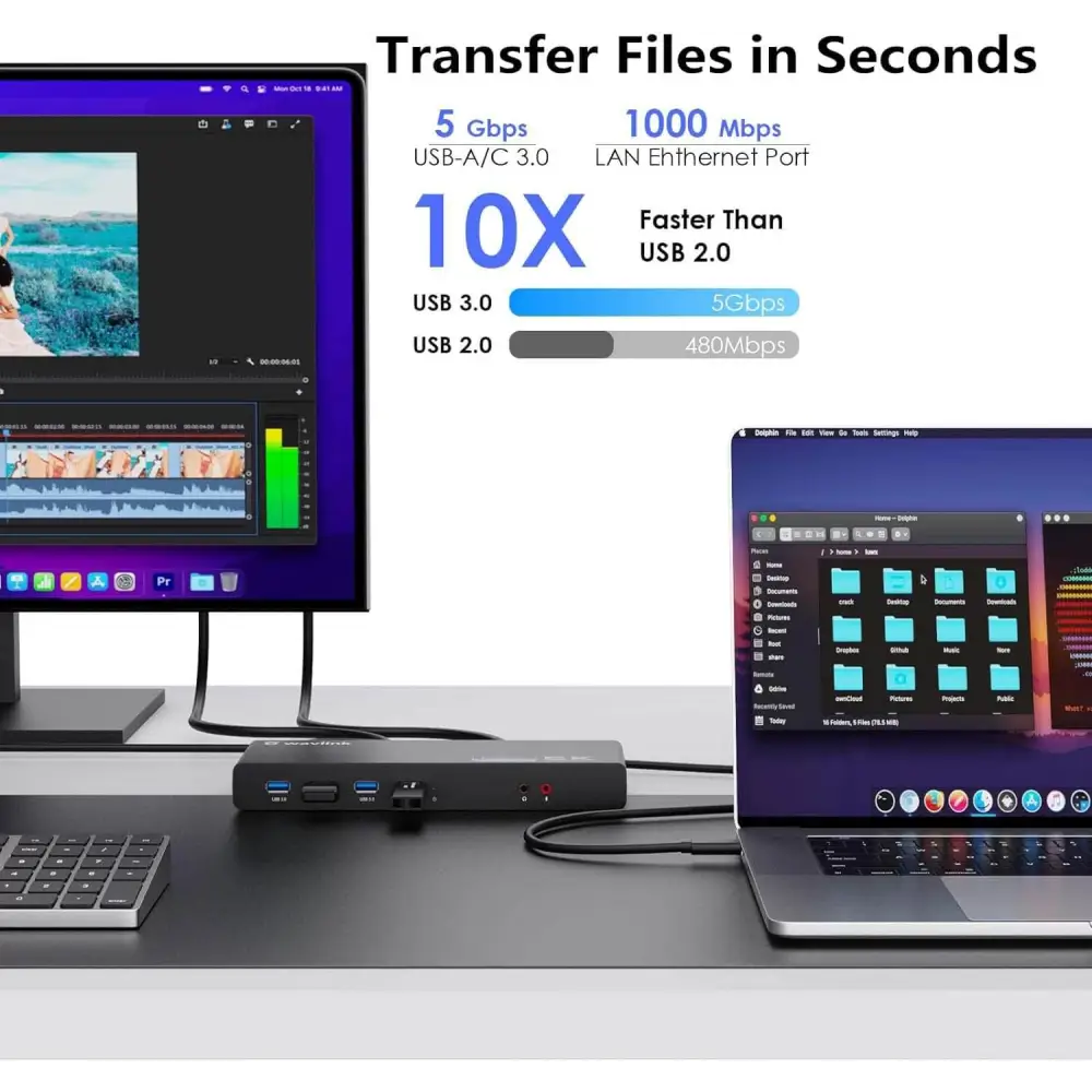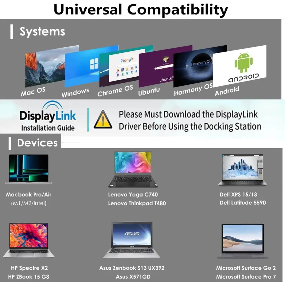 - 【Wide Compatibility】Complies with Windows XP/Vista/7/8/8.1/10/11, Mac 10.14-12.x or latest, Chrome, Android, Ubuntu systems. 💓💓💓NOTE: NO SUPPORT Linux/Unix or ARM based Windows operating systems (such as Surface RT). Need to download Displaylink driver before using the dock.