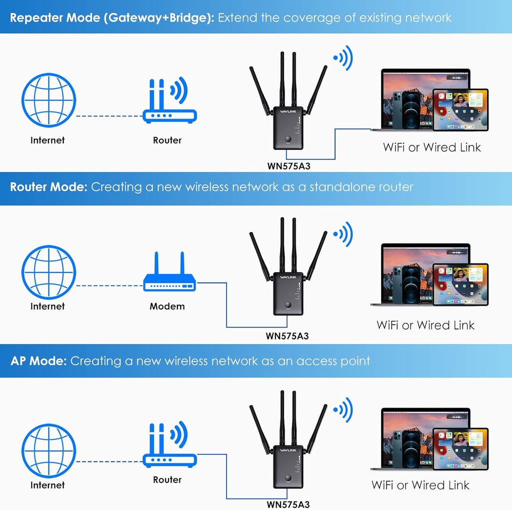 - ★【More than Just a Wi-Fi Extender】: 575A3 is not just repeater but wireless access point (AP) or router and you can choose any mode by the switch button.Easily expand wireless coverage, accessible from almost any device, including iOS and Android mobile platforms
